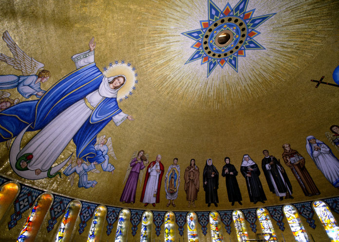 When it was blessed during Mass, incense rose above the congregation and bright lights were turned on to give a better view of the newly finished dome that includes the words of the Nicene Creed encircling the base and a depiction of the Holy Trinity, Mary, the four Evangelists, angels and more than a dozen saints connected to the United States or the shrine.