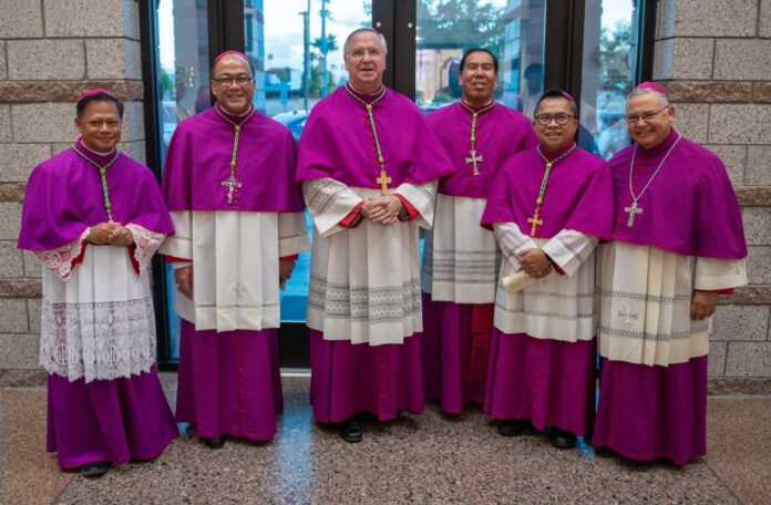 Six Catholic bishops and over 50 priests representing 11 dioceses gathered for Mass on Tuesday evening (Nov. 18) at All Saints Catholic Church in Mesa, Ariz., to kick-off the bi-annual Leadership Council gathering of the National Association of Filipino Priests-USA. The Mass also marked the 30th anniversary of Fr. Joevensie “Jovi” Balang’s ordination to the priesthood. Bishop John Dolan and Auxiliary Bishop Eduardo Nevares of Phoenix were joined by Archbishop Rex Alarcon (Archdiocese of Caceres – Philippines), Auxiliary Bishop Rey Bersabal (Diocese of Sacramento), Auxiliary Bishop Anthony Celino (Diocese of El Paso) and Auxiliary Bishop Andres Ligo (Diocese of San Jose) for the special occasion.