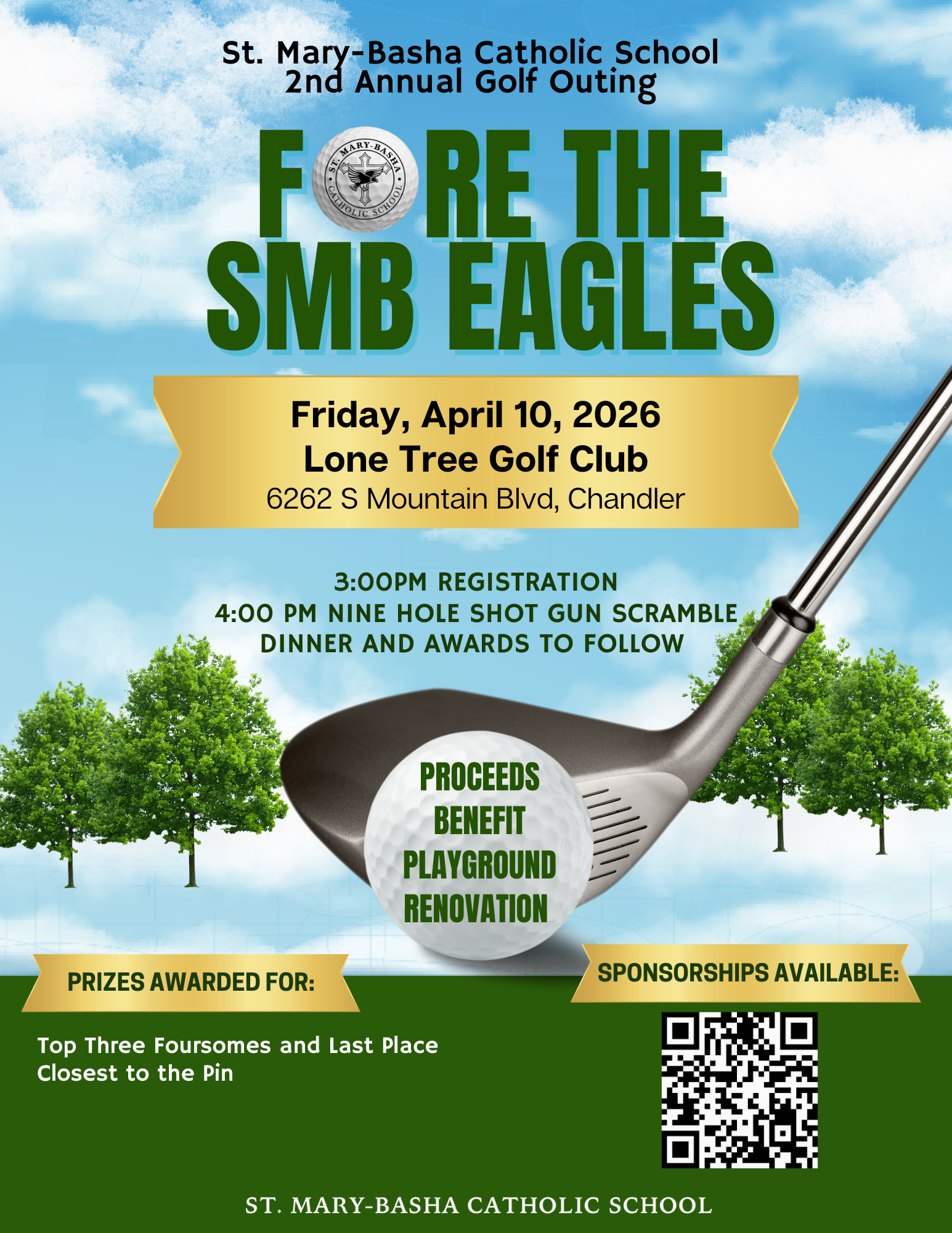 FORE the SMB Eagles Golf Outing is more than just a day on the green—it’s a chance to drive change and champion our playground renovation. Hosted at the beautiful Lone Tree Golf Club in Chandler, AZ, this unique charity event blends the excitement of a golf scramble with supporting our students. Participants will enjoy a day of friendly competition, complete with warm-up driving range access, golf carts, and dinner making it a true community celebration. Join us as a sponsor or golfer!