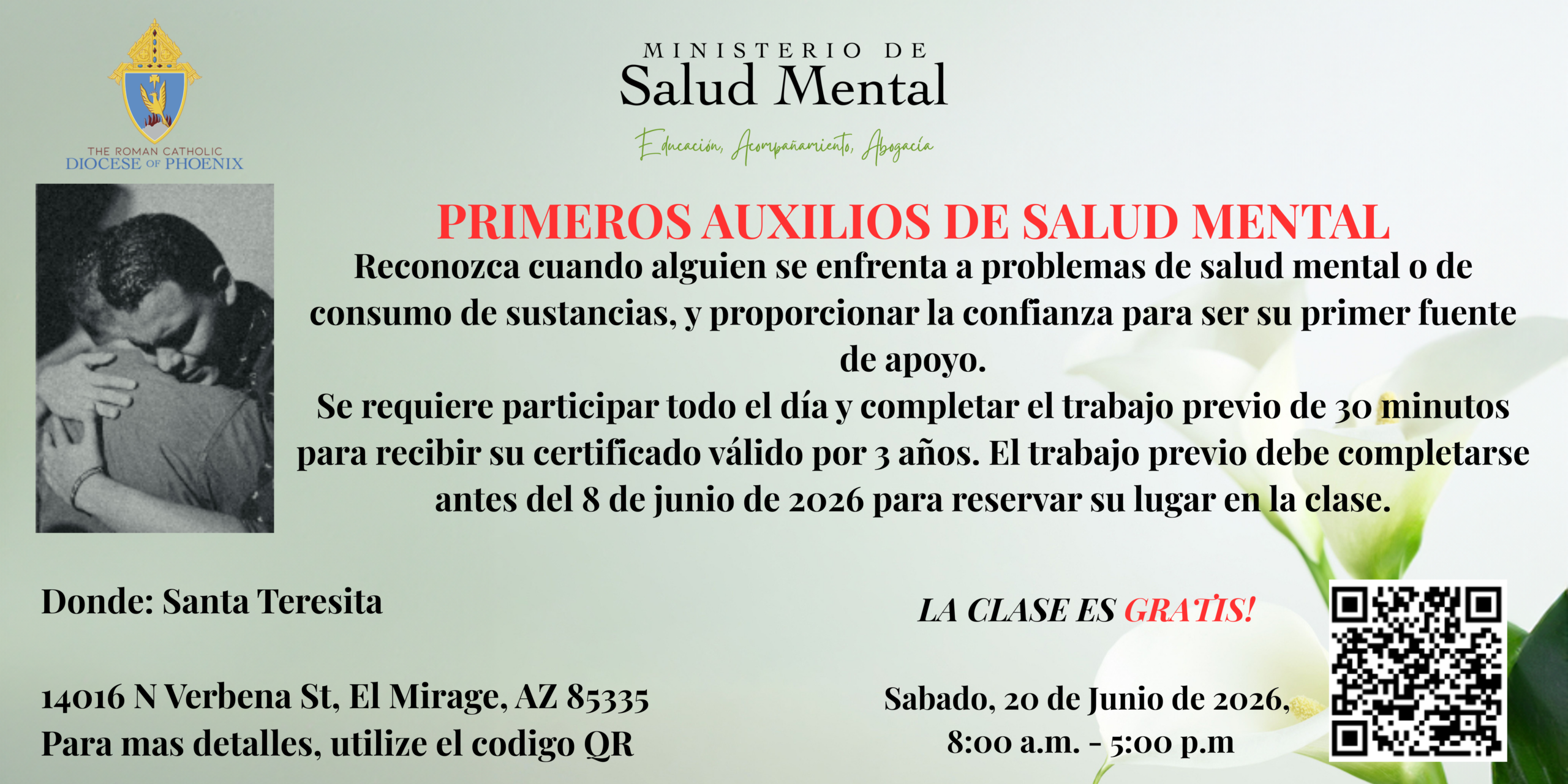 Sabado, 20 de Junio de 2026, 8:00 a.m. – 5:00 p.m. Santa Teresita, 14016 N Verbena St, El Mirage, AZ 85335. Se requiere participar todo el día y completar el trabajo previo de 30 minutos para recibir su certificado válido por 3 años. El trabajo previo debe completarse antes del 8 de junio de 2026 para reservar su lugar en la clase.