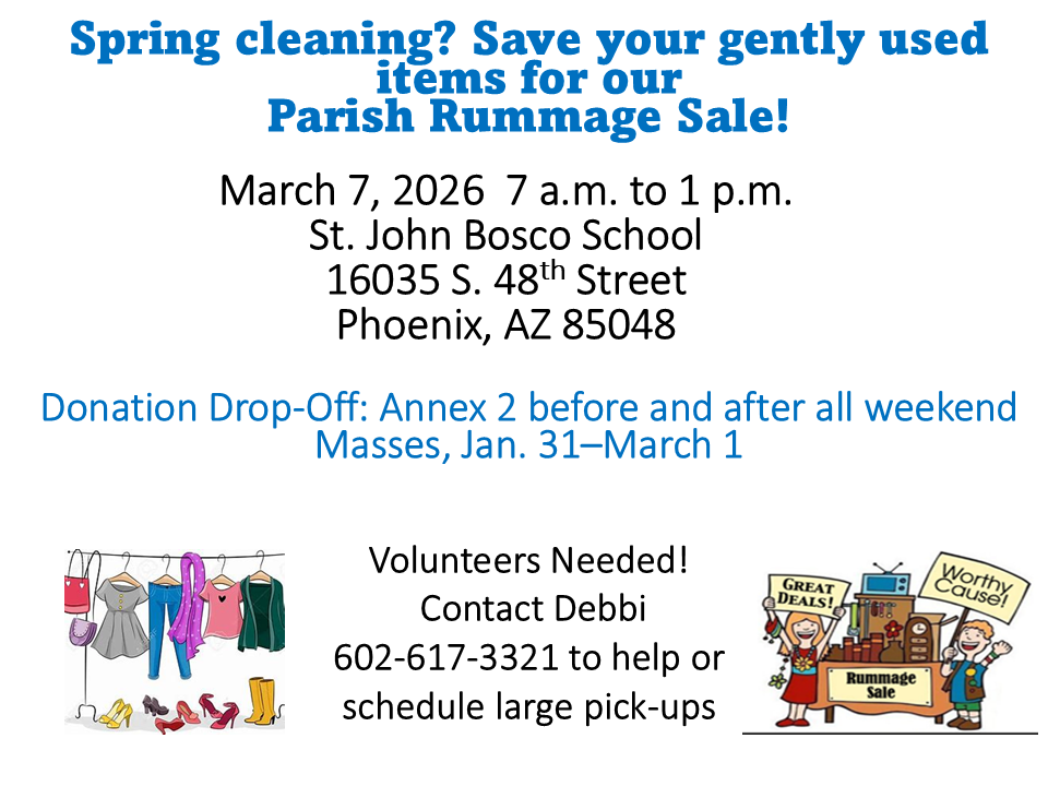 Come and join us for our annual indoor/outdoor large rummage sale! There’s something for everyone! We have clothing, household items, tools, collectables! The event takes place at St. John Bosco Multi-Purpose room on Saturday, March 7th from 7 a.m. to 1 p.m.