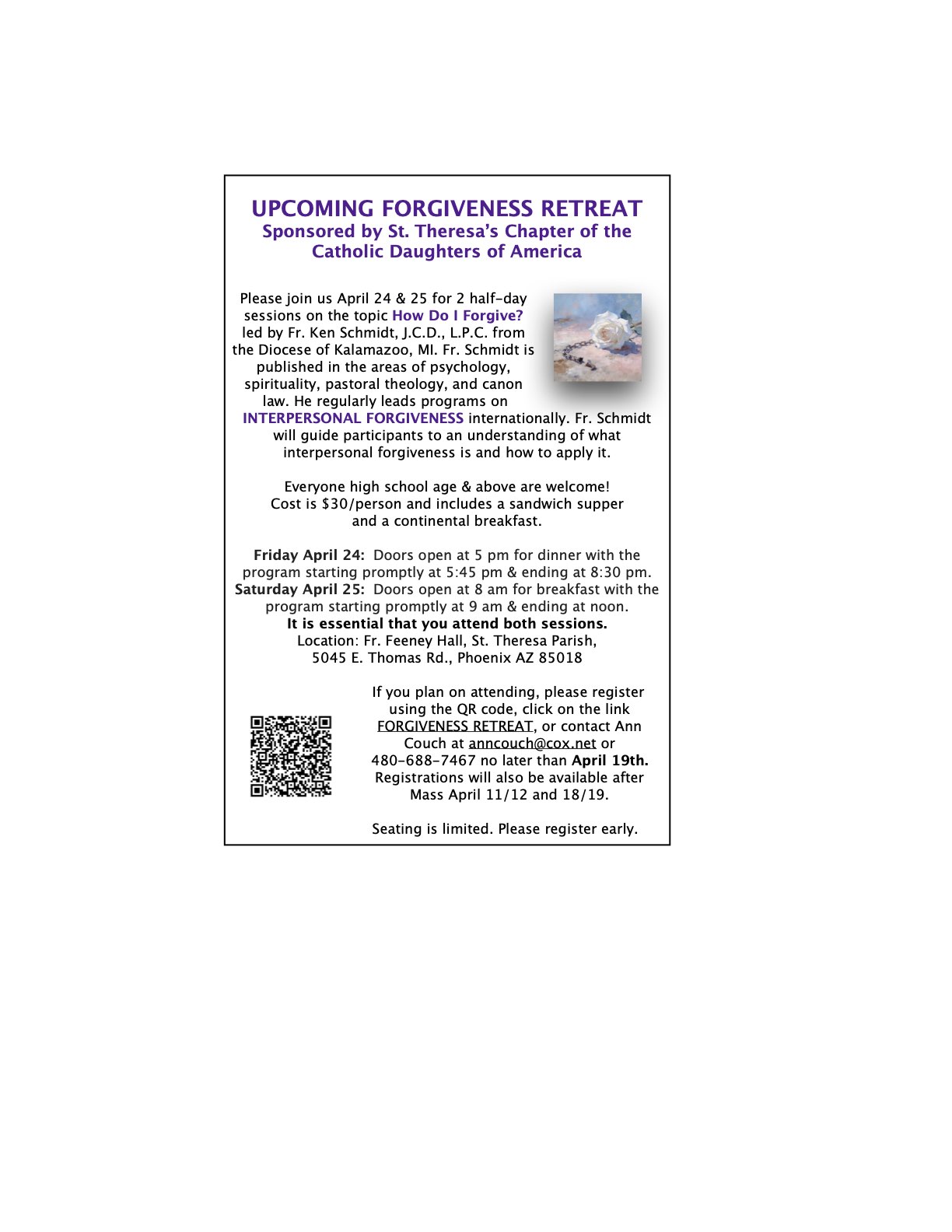 You are warmly invited to attend our “Surviving Divorce” support group at St. Timothy. Led by caring individuals that will share how they have personally found hope, healing and comfort after divorce through the power of Christ’s Love and Grace. You will also learn coping skills, gain wisdom and receive spiritual and practical advice from […]