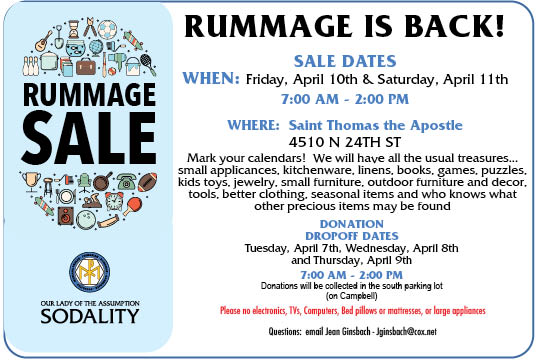 Rummage Sale - Friday, April 10 and Saturday, April 11 7am - 2pm both days Saint Thomas the Apostle - 2410 N 24th Street, Phoenix Come and find all the usual treasures...small appliances, kitchenware, linens, books, games, puzzles, kids toys, jewelry, small furniture, outdoor furniture and decor, tools, better clothing, seasonal items and who knows […]