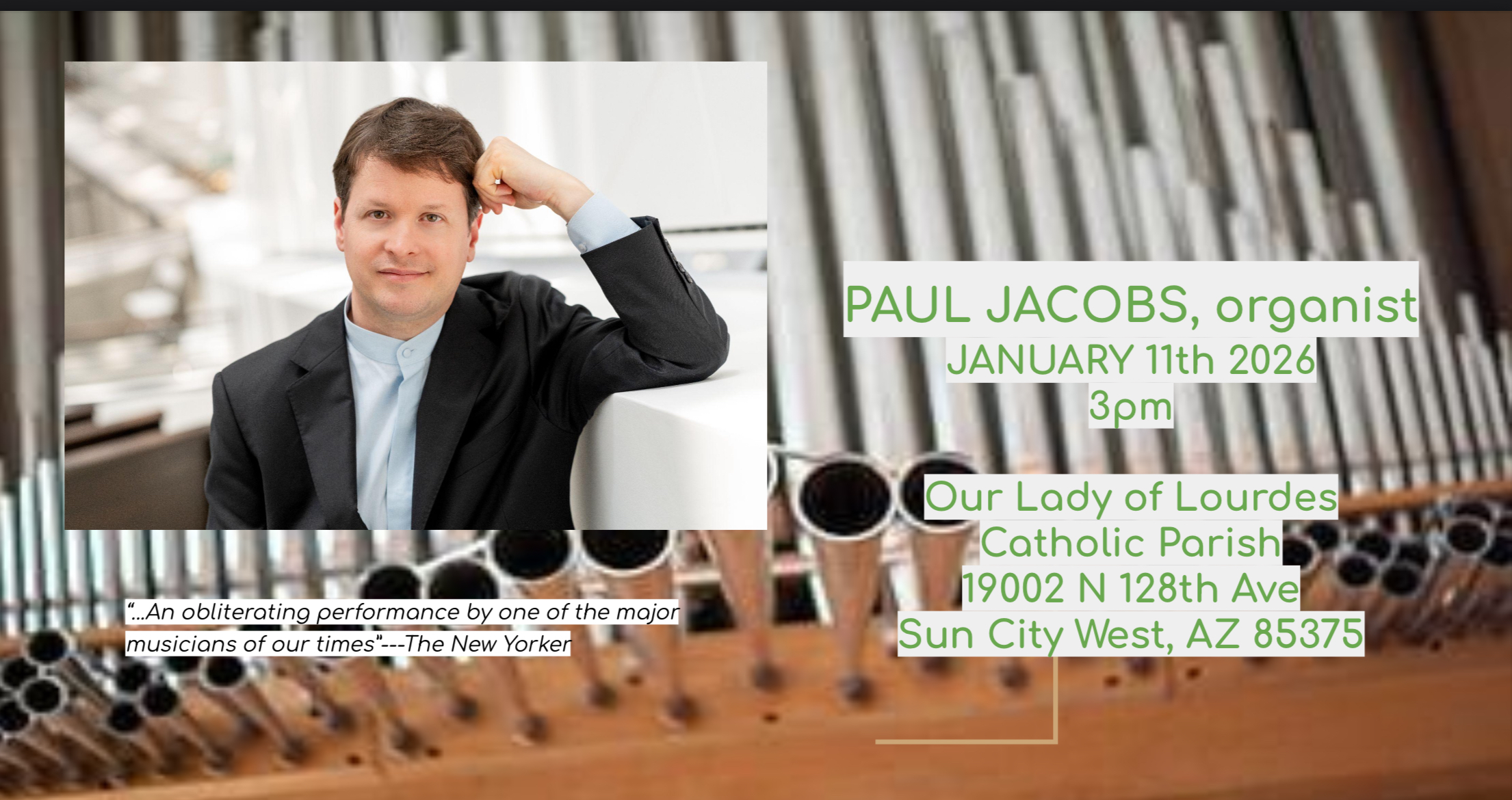 Grammy award winning organist & Juilliard faculty member Paul Jacobs returns to Arizona to perform a free recital of sacred & secular organ classics. The recital will take place at Our Lady of Lourdes Catholic Parish 19002 N 128th Ave Sun City West, AZ 85375 Reception to follow. |
