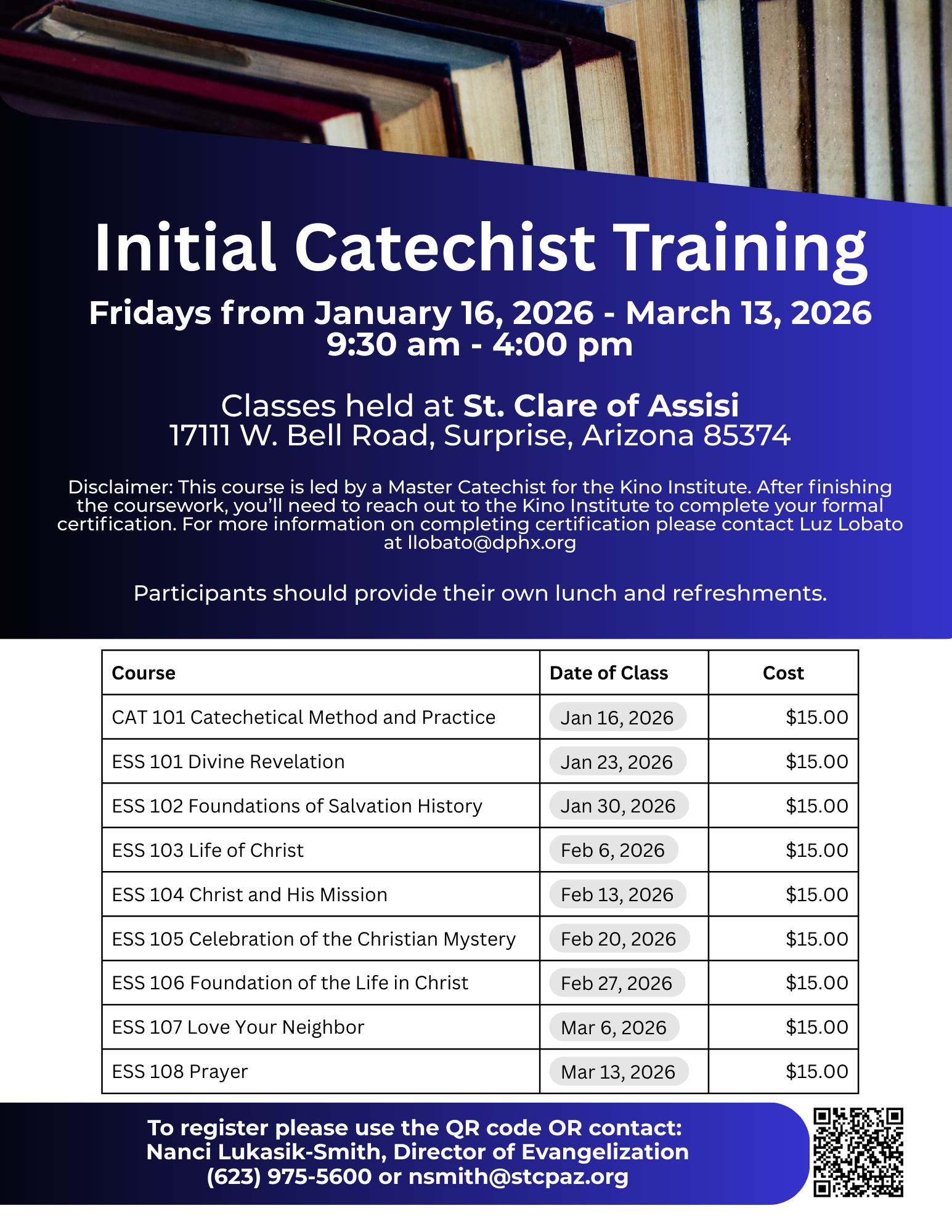 Join us for a series of eight (8) one-day seminars covering the essentials of Catholic doctrine and dogma. These sessions will provide a strong foundation for anyone seeking to grow in faith and knowledge. Catechist Formation - In addition, two (2) one-day seminars focused on methodology and pedagogy for handing on the Catholic Faith will […]
