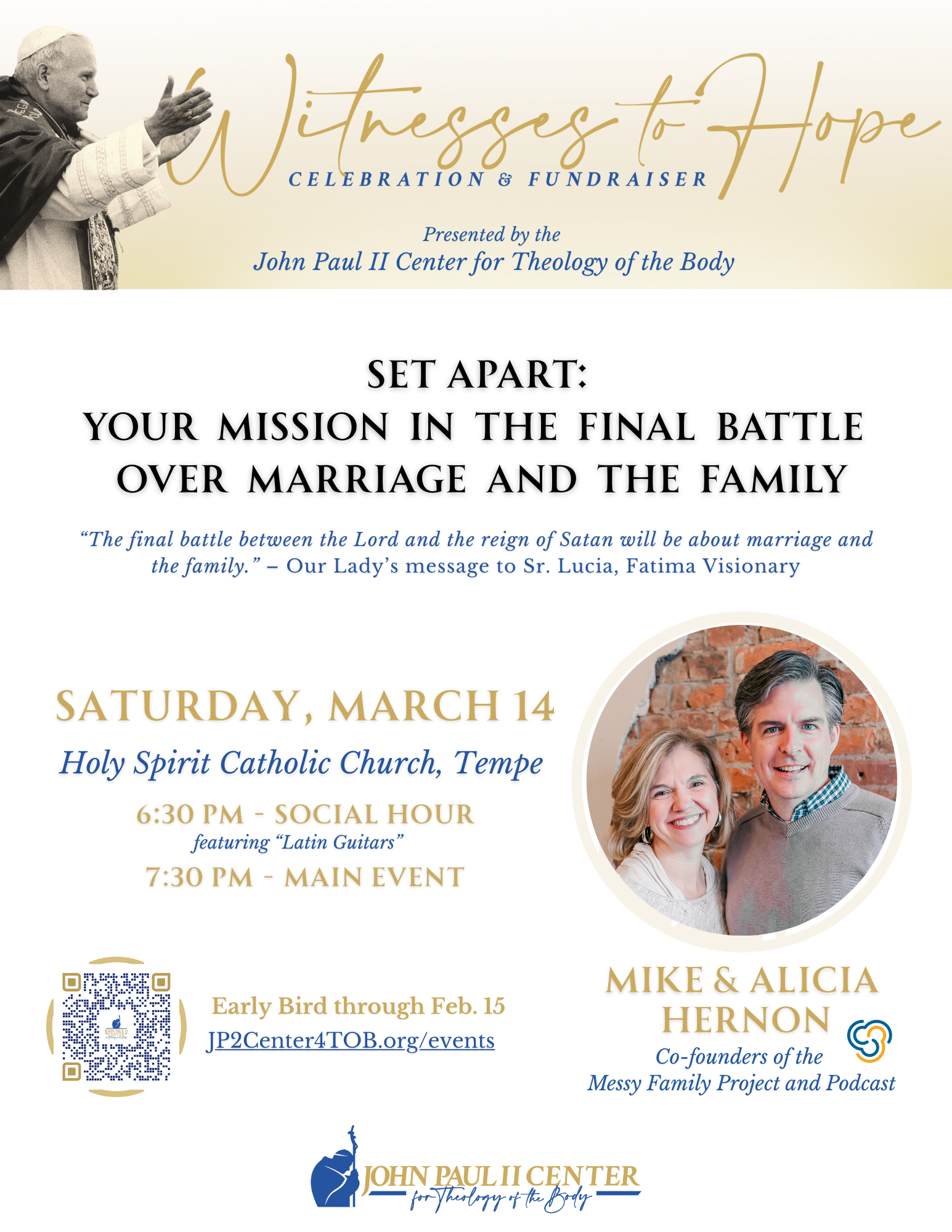 Everyone comes from a family, sometimes dysfunctional yet destined for eternal love. This year’s Witnesses to Hope Celebration & Fundraiser (to benefit the John Paul II Center for Theology of the Body) will address a reality many sense but struggle to name: the most decisive spiritual battle of our time is being fought over marriage […]