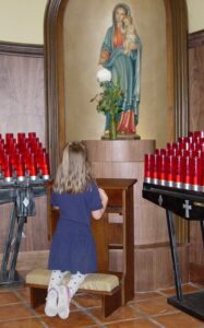 In the afternoon, pre-K and kindergarten students take part in a scavenger hunt around the church campus to find hidden images of Our Lady. Afterward, the classes gather inside the church while a teacher lights a candle next to the statue of the Blessed Mother. Time is then given for quiet prayer.